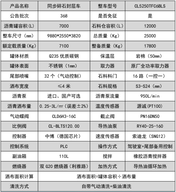 ??????湖北程力汽車:程力CL5250TFC6BLS型陜汽德龍后八輪瀝青同步碎石封層車產(chǎn)品型號及參數(shù)配置,程力CL5250TFC6BLS型陜汽德龍后八輪瀝青同步碎石封層車高清圖片,程力汽車系列程力CL5250TFC6BLS型陜汽德龍后八輪瀝青同步碎石封層車最新報價請撥打客服熱線。車輛主要配置 產(chǎn)品商標 程力牌 公告批次 372(擴展) 產(chǎn)品名稱 同步碎石封層車 產(chǎn)品型號 CL5250TFC6BLS 總質(zhì)量(Kg) 25000 罐體容積(m3) 額定載質(zhì)量(Kg) 7070 外形尺寸(mm) 9900 × 2550 × 3820 整備質(zhì)量(Kg)...