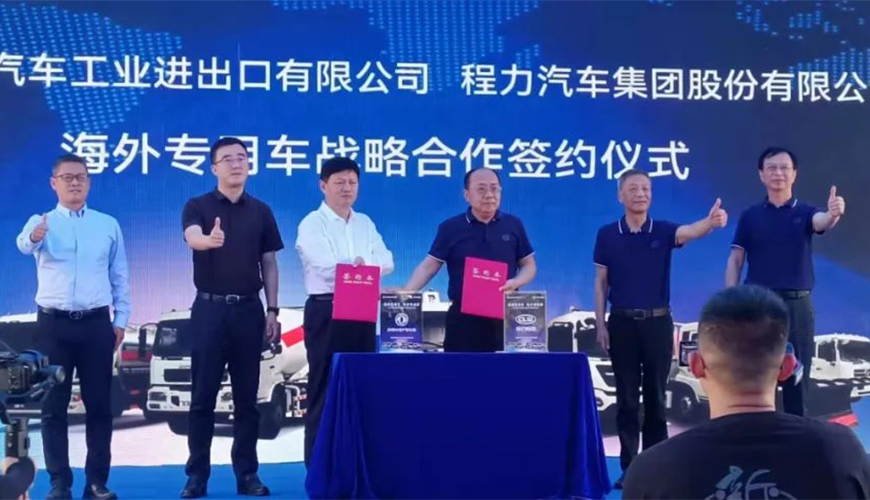 在這次線下大型東風(fēng)商用車海外市場新產(chǎn)品推薦會上,中國東風(fēng)汽車工業(yè)進出口有限公司與程力汽車集團股份有限公司聯(lián)合舉行了海外專用車戰(zhàn)略合作簽約儀式,雙方高層領(lǐng)導(dǎo)簽約后合影紀念。