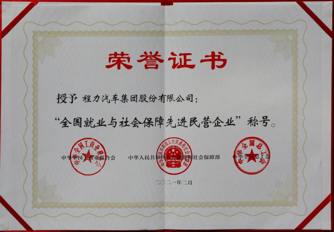 3月2日,程力汽車集團(tuán)股份有限公司收到國(guó)家人力資源和社會(huì)保障部、中華全國(guó)工商業(yè)聯(lián)合會(huì)、中華全國(guó)總工會(huì)聯(lián)合頒發(fā)的“全國(guó)就業(yè)與社會(huì)保障先進(jìn)民營(yíng)企業(yè)”榮譽(yù)證書及牌匾,這是程力汽車集團(tuán)股份有限公司在2021年初被授予的開門紅全國(guó)性殊榮,也是程力集團(tuán)繼2020年連續(xù)三次受到全國(guó)性榮譽(yù)表彰。